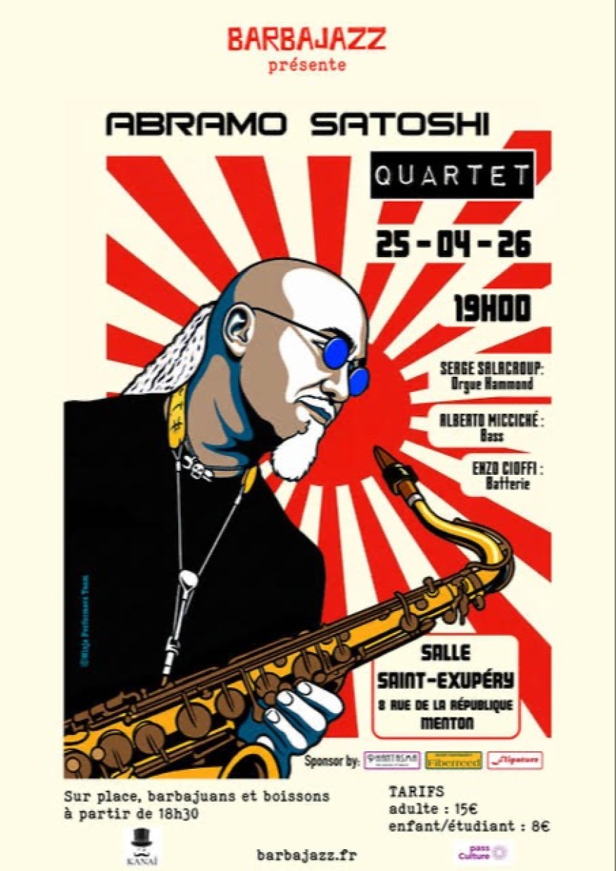 Jazz à St Exupéry le samedi 25 avrilAbramo Satoshi est un musicien et compositeur multi-instrumentiste. A l'occasion de ce premier concert organisé par Barbajazz, Abramo Satoshi, aux saxophones, propose une performance de musique électro-acoustique accompagné de Serge Salacroup à l'orgue Hammond, d'Alberto Micciché à la basse et d'Enzo Cioffi à la batterie. Au programme, des compositions d'Abramo Satoshi, dans un esprit fusion jazz et bossanova.