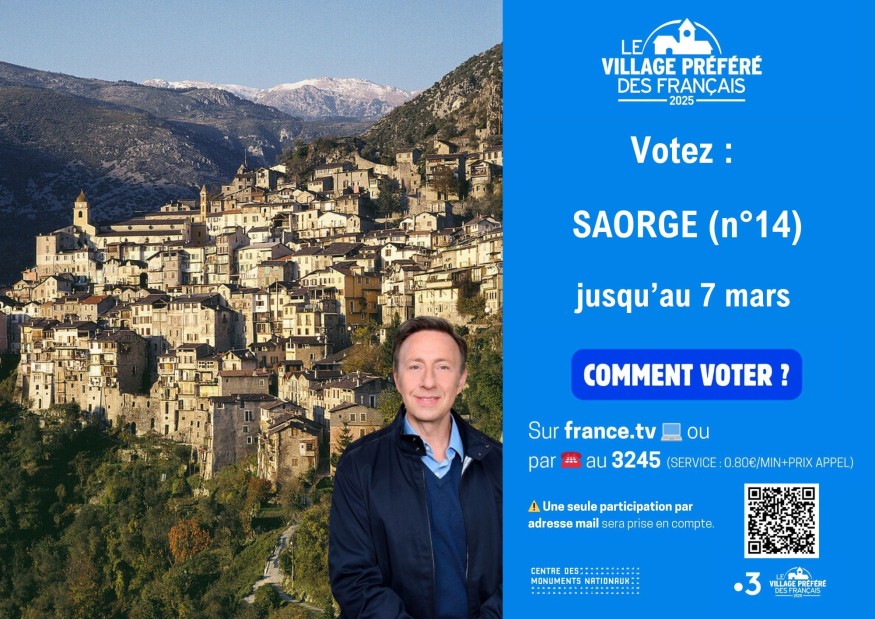 Les votes pour l’élection du "Village Préféré des Français" 2025 sont ouverts du 17 février au 7 mars. Pour soutenir Saorge (n° 14) et lui offrir le titre tant convoité, il vous suffit de voter sur le site de France Télévisionshttps://participez.france.tv/quiz/1557314_56/.html ou par téléphone au 3245 (service : 0,80 €/min + prix de l’appel). Partagez également l’information sur vos réseaux sociaux pour inviter vos amis à voter et faire découvrir ce village d’exception.