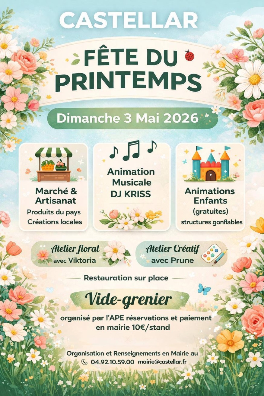Organisée par l'APE, venez découvrir et participer à cette " Fête du Printemps " à Castellar, ce Dimanche 3 mai.